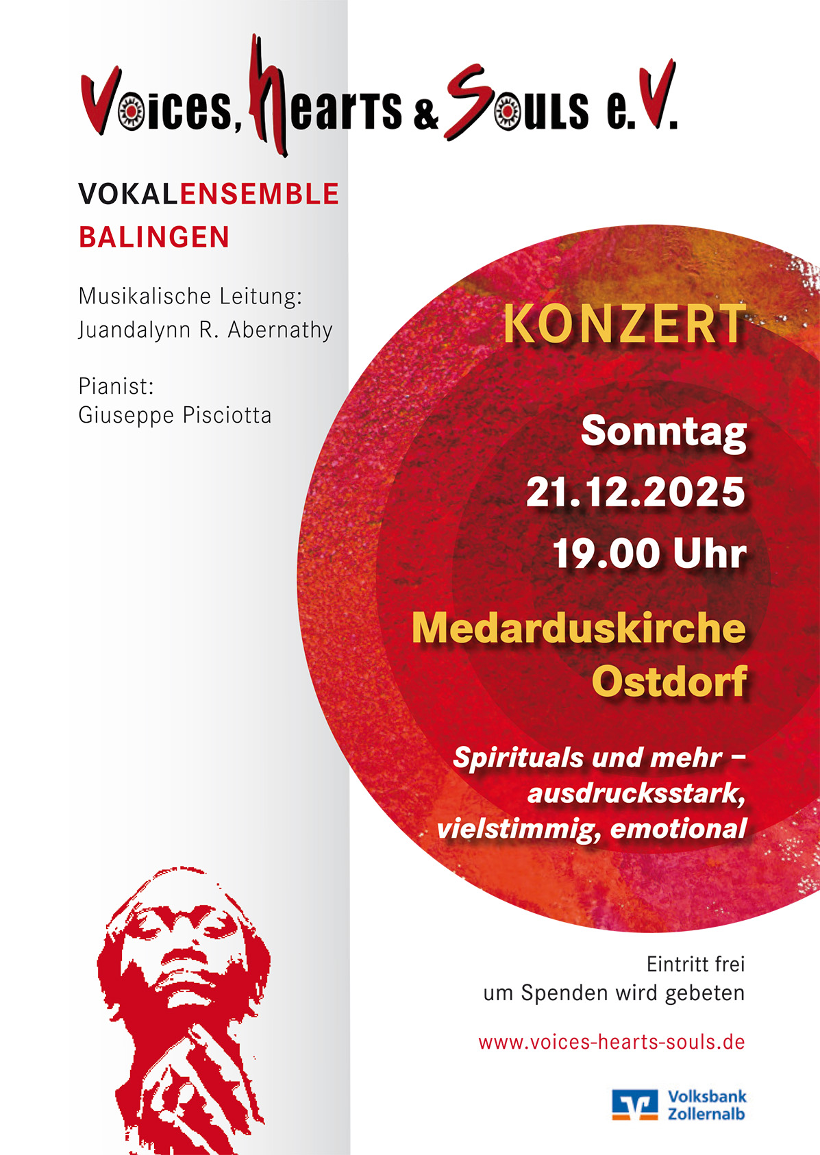 Am Sonntag, den 21.12.2025 lädt Sie unser Vokalensemble um 19:00 Uhr herzlich in die Medarduskirche in Ostdorf ein. Es erwartet Sie ein abwechlungsreiches Programm aus besinnlichen sowie kraft- und temperamentvollen Spirituals und modernen Liedern. Juandalynn R. Abernathy und die Sängerinnen und Sänger der Vokalensembles freuen sich schon auf Ihren Besuch!